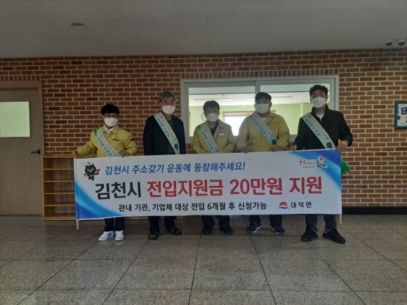 | 대덕면행정복지센터(면장 박종기)에서는 지난 29일 대덕면 관기리에 소재한 링컨중․고등학교를 방문하여 타 지역에서 입학하는 신입생을 대상으로 김천 주소 갖기 운동을 홍보했다. 대덕면행정복지센터 직원들은 입학생들을 대상으로 김천의 인구 증가 시책 홍보 등 현장에서 전입신고 접수 및 전입지원에 따른 인센티브를 안내하는 등 인구증가를 위해 적극 홍보에 나서, 예비 이웃을 맞이할 준비를 전개했다.
