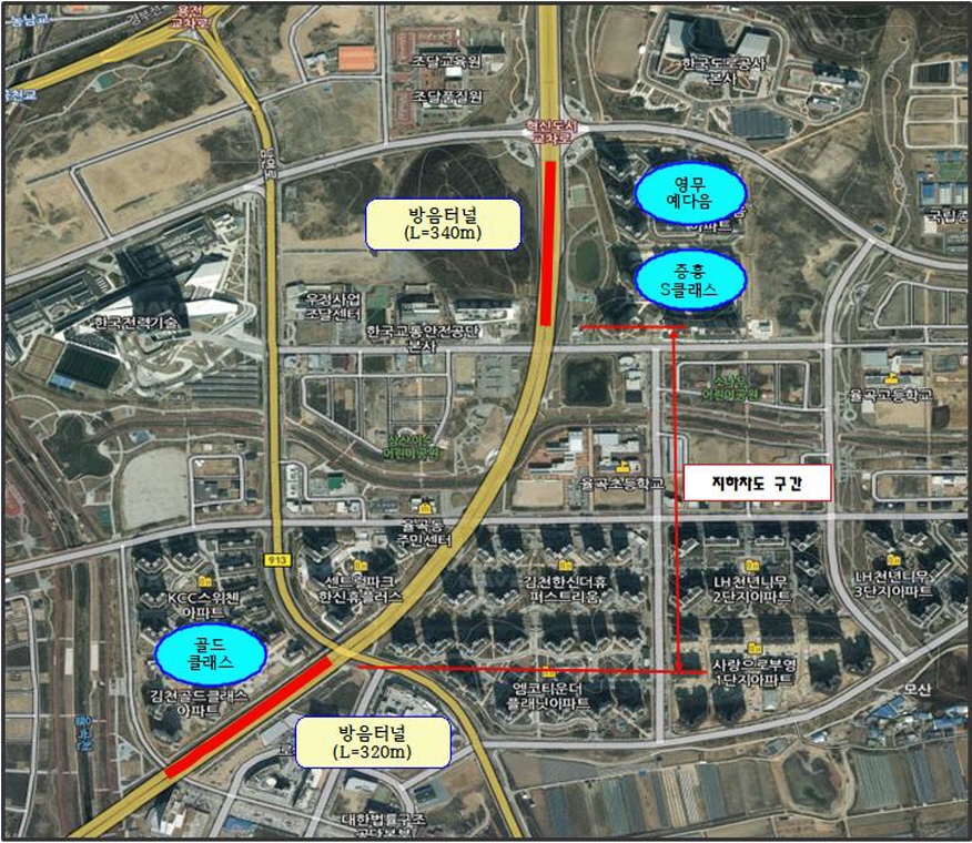 | 김천시(김충섭 시장)는 혁신도시 내 도심을 가로지르는 도로 교통소음으로 일상생활에 고통을 호소하고 있는 공동주택 입주민들의 고충을 조기에 해결하기 위해 직접 발 벗고 나섰다. 소음발생 배경은 한국토지주택공사(LH)가 혁신도시를 조성하면서 부산지방국토관리청에 위탁한 국도대체우회도로인 지하도로 일부구간이 복개되지 않아 발생되는 소음으로 주민불편을 야기하고 있는 실정이다.