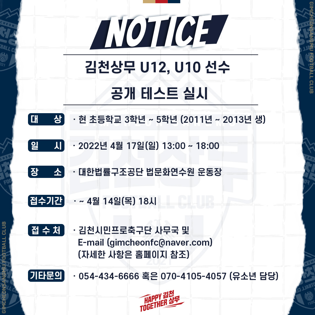 김천상무프로축구단(대표이사 배낙호)이 4월 17일(일) 13시부터 18시까지 대한법률구조공단 법문화교육센터 인조잔디구장에서 U12, U10 선수 모집 입단 테스트를 실시한다. 대상은 현 초등학교 3학년~5학년(2011년~2013년 출생)이다.