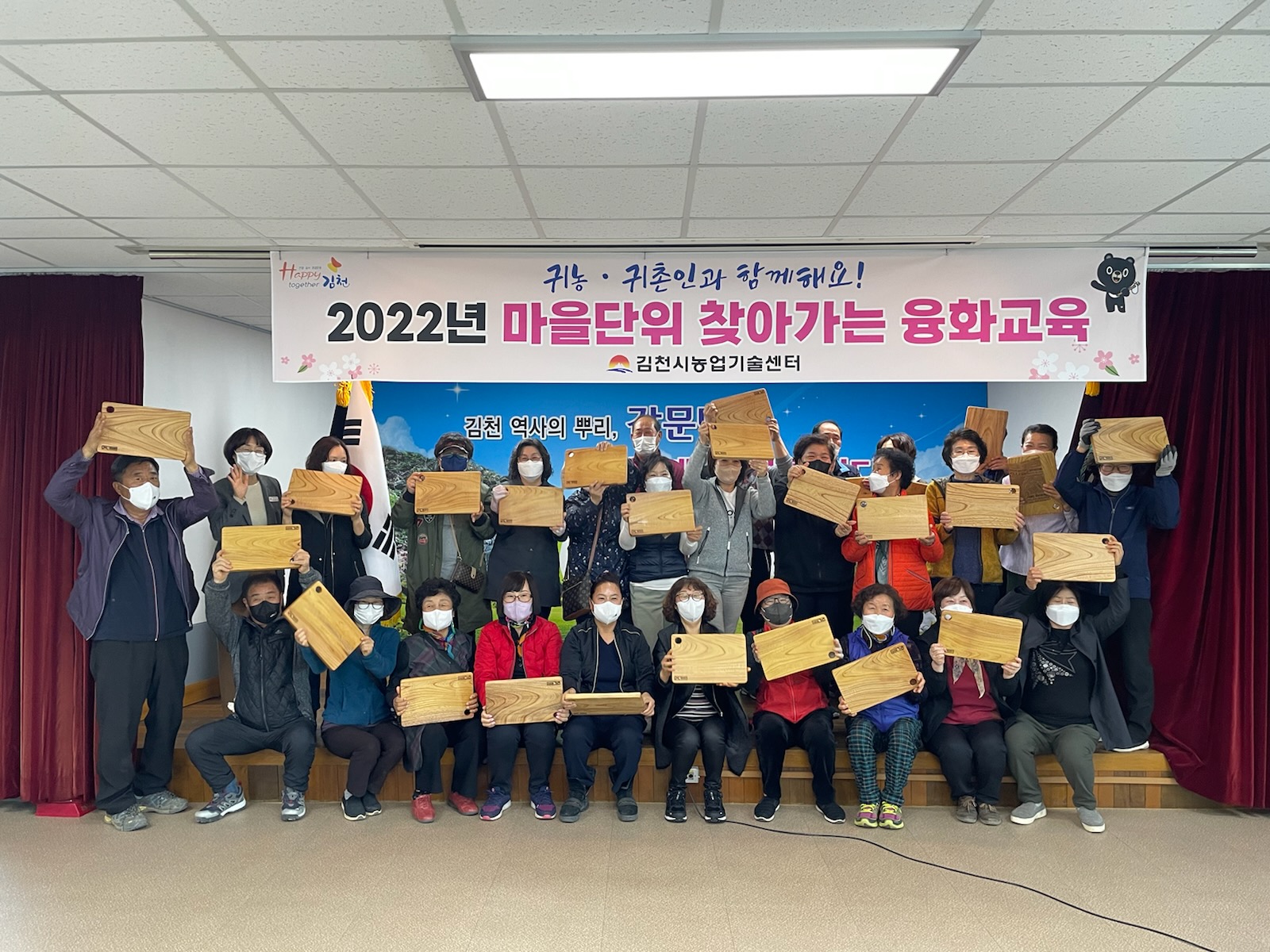 첫 교육은 지난 6일 감문면 행정복지센터에서 감문면 귀농·귀촌인, 지역주민 40명이 참석한 가운데 「해피투게더 김천 운동」을 연계한‘웃음으로 소통하고 힐링하라!’강의를 통해 서로간의 갈등을 회복하고, 소통하는 기회를 마련했으며 함께하는 목공예‘도마 만들기’체험으로 귀농·귀촌인과 지역주민이 서로 돕고 배려하는 시간이 되었다.