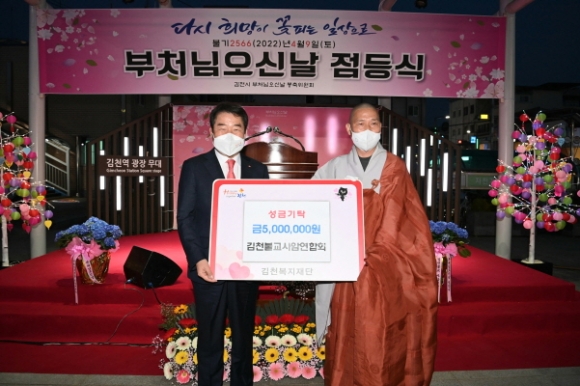 |  | | | ⓒ 김천내일신문 | | 김천불교사암연합회(회장 적인스님)는 「불기 2566년 부처님 오신날 봉축탑 점등 법요식」에서 지난 4월 9일 김천복지재단에 성금 5백만원을 기탁했다.