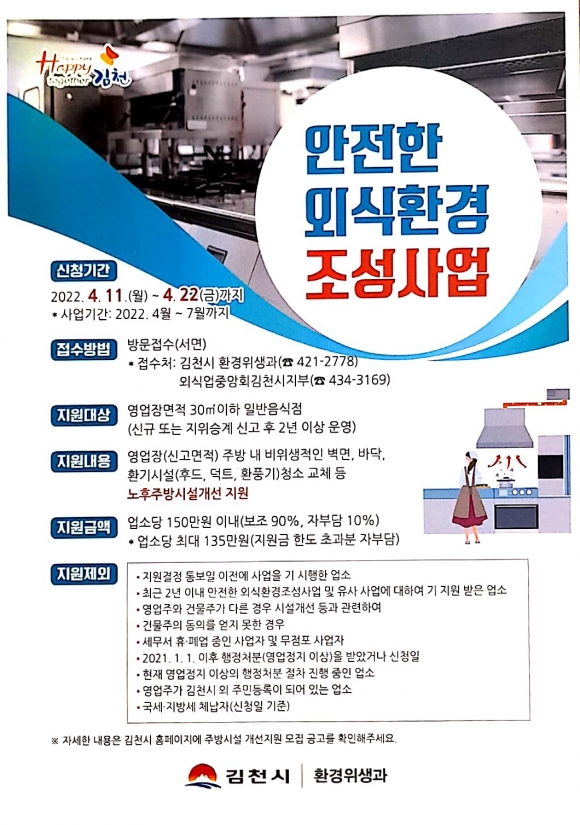 신청기간은 4월 11일부터 4월 22일까지로 사업 참여 희망 영업주는 김천시청 홈페이지 고시·공고란에 게재된 공고문을 참고해 신청서와 기타 서류구비 후 김천시 환경위생과 또는 외식업김천시지부로 신청하면 된다.