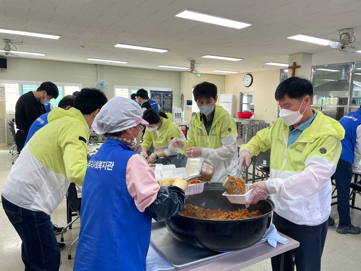 | 김천시 시설관리공단(이사장 김재광)에서는 사회공헌활동의 일환으로 이사장과 직원들이 참여하여 4월 11일부터 12일까지 이틀간 김천 부곡 사회복지관의 무료급식소(평화동)를 찾아 도시락 포장과 배달 봉사활동을 실시했다고 밝혔다. 부곡 사회복지관의 무료급식소는 코로나19의 장기화로 인하여 비대면으로 급식을 배달하고 있으며, 시설관리공단 직원은 음식 조리, 청소 등 급식 업무를 지원하고 90여 가구에 급식(도시락)을 전달하였다.