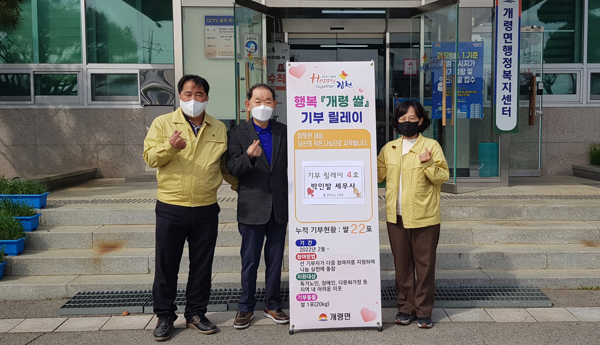 | 개령면 Happy together『행복, 개령쌀』나눔 기부릴레이는 4번째 주자로 박인발세무회계사무소(대표 박인발)에서 쌀 20kg 10포를 기부하는 것으로 4월의 산뜻한 시작을 알렸다.