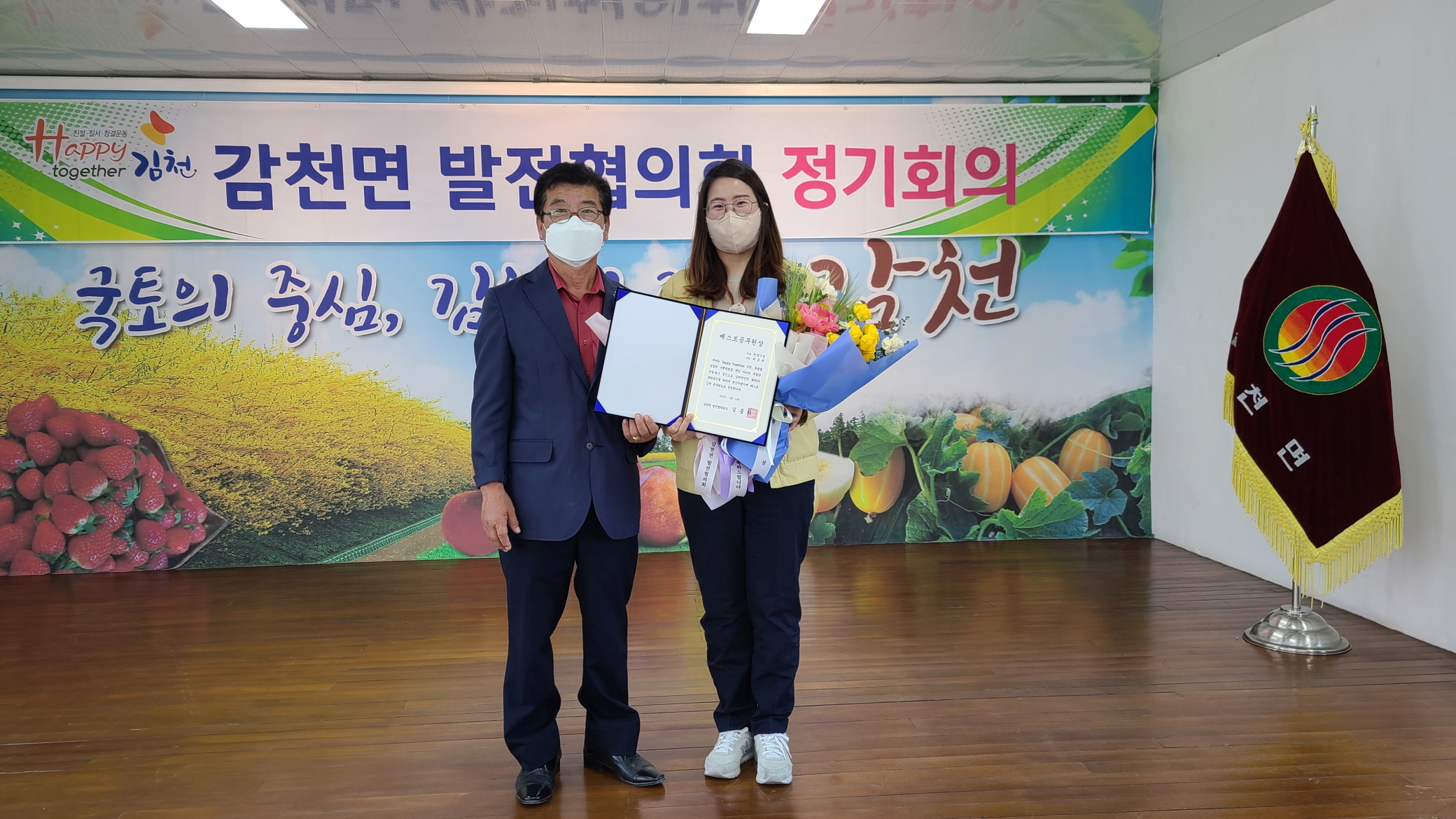 김종화 발전협의회장은 “지난 총회에서 우리 면을 위해 적극행정을 추진하는 직원을 1년에 한번 베스트 공무원으로 선정하기로 했다. 올해 회원들에게 최다표를 받은 최은옥 주무관이 제1회 베스트 공무원으로 선정되어 시상을 하게 되어 기쁘게 생각한다.”라고 했다.