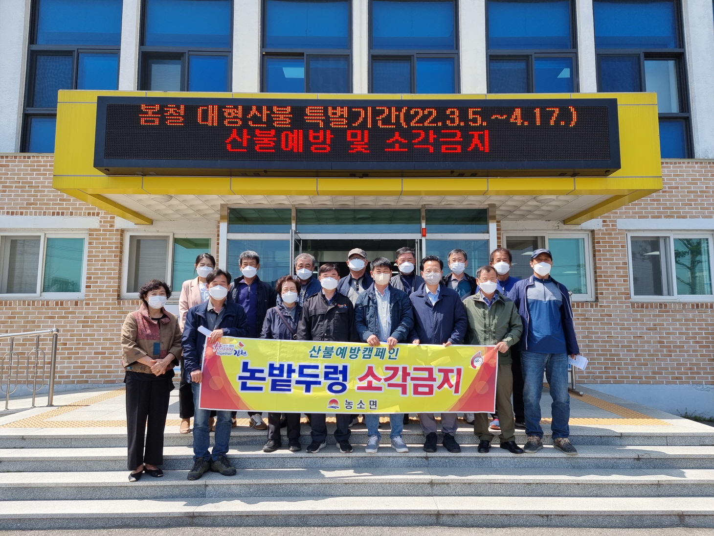 | 김천시 농소면(면장 강전원)은 2022년 봄철 영농기간 동안에 논밭두렁 소각행위를 근절하기 위한 캠페인을 지난 4월 11일 마을이장들이 모두 참석하여 함께 실시했다.