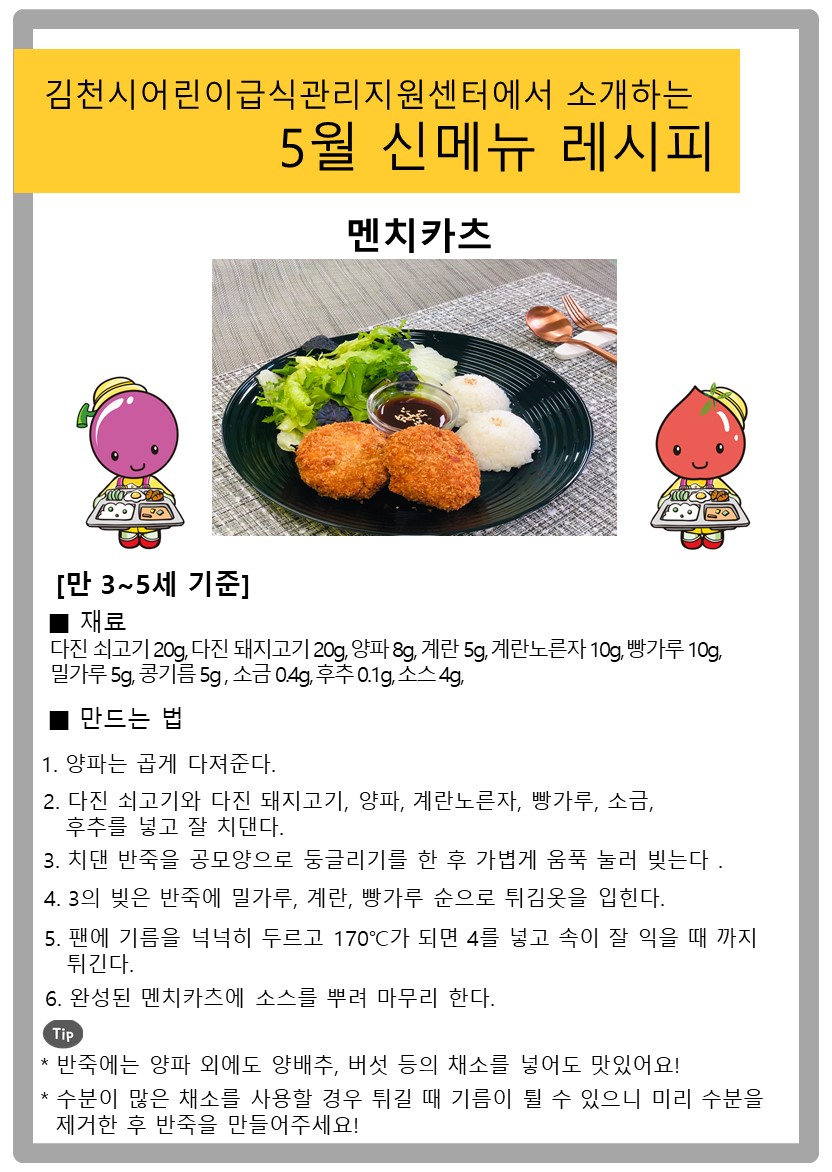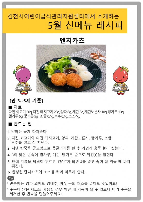| 김천시 어린이급식관리지원센터에서는 가정에서 활용할 수 있도록 어린이 급식소에 매달 제공되는 식단의 신메뉴 레시피를 영상으로 제작하여 제공하고 있다. 이번 5월 식단의 신메뉴 레시피는 멘치카츠이다.
