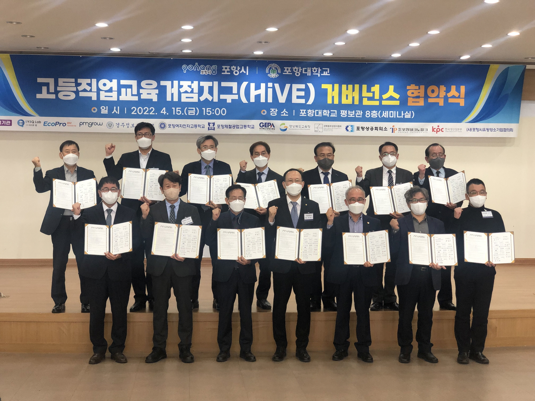 | 경북교육청은 지난 4월 15일(금) 포항시와 포항대학교, 지역거점 기업, 직업계고 유관기관과 지역밀착형 고졸 인재 성장 경로 구축을 위한 업무협약을 체결했다고 밝혔다.