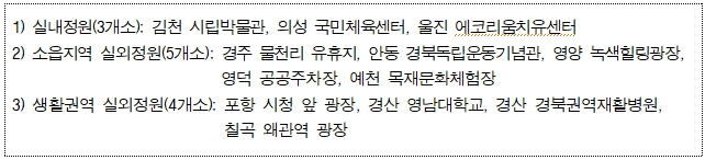 경북도는 지금까지 총 25억원을 투입해 총 3개소*의 생활밀착형 정원을 조성해 지역민들에 제공했으며, 매년 사업량을 확대해 나갈 방침이다. *2020년도 칠곡군 호국평화기념관 실내정원, 2021년도 안동시 안동의료원 실내정원, 의성군 의성읍 생활체육시설 야구장 주변 소읍지역 실외정원