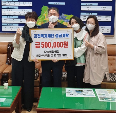 | 김천시 대신동 소재의 “다솜어린이집 원아·학부모 및 교직원 일동”은 지난 4월 19일 대신동행정복지센터를 방문해 김천복지재단 운영에 조금이나마 보탬이 될 수 있도록 써달라며 후원금 50만원을 기탁했다. 이날 기탁에 참석한 다솜어린이집 학부모와 임현정 원장은 “코로나19 장기화로 힘든 시간을 보내고 있는 이웃들에게 도움이 되길 바라며 원아들, 학부모, 그리고 교직원의 정성을 모았다. 특히 자라나는 아이들이 지역사회 복지에 기여할 수 있어 의미가 깊고 또 앞으로도 정기적 기부를 이어 나가겠다”고 말했다.