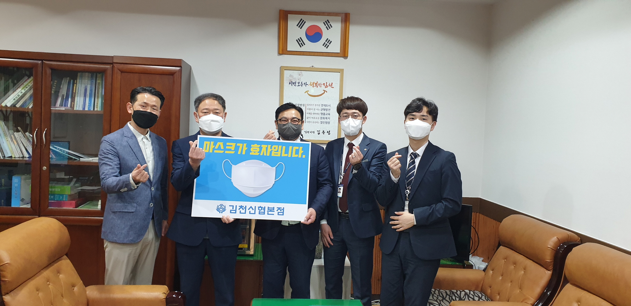 | 김천신협본점(이사장 최윤애)에서는 지난 4월 22일 대신동행정복지센터를 방문해 어려운 이웃에게 전달해 달라며 비말마스크 5,000매를 기탁했다. 이날 기탁에 참석한 강충열 부장은 “최근 코로나로 인한 거리두기가 해제되었으나, 아직은 코로나가 여전히 우리 주위에 머물러 있어 경계를 늦추지 말아야 하며, 장기화로 힘든 시간을 보내고 있는 이웃들에게 조금이나마 도움이 되길 바라며 마스크를 기탁하게 되었다”고 말했다.