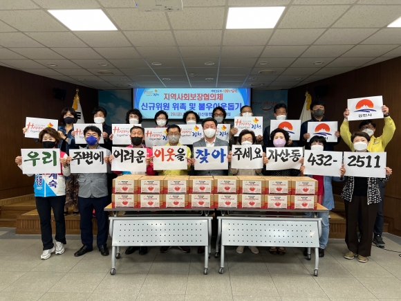 | 자산동 지역사회보장협의체(이하 협의체)에서는 지난 4월 29일 자산동행정복지센터에서 올해 첫 정기회의를 시작하면서 신규 위원 위촉 및 독거노인 불우이웃돕기 행사를 개최했다. 김대기 협의체 위원장을 비롯한 위원 14명과 신규 회원으로 위촉된 7명까지 총 21명이 참석해 자리를 빛냈다. 장한섭 자산동장이 김천시장을 대신해 신규 위원에 대한 위촉장을 수여했다. 이날 협의체 신규 위원으로 위촉된 7명은 통장 3명, 자영업자 1명, 복지기관종사자 1명, 소상공인 1명, 주부 1명이 참여해 협의체가 재구성됐다. 협의체 재구성을 마치고 불우이웃돕기를 위해 사전에 미리 준비한 생필품을 위원들에게 나눠주고 독거노인 어르신 41분에게 전달할 예정이다.