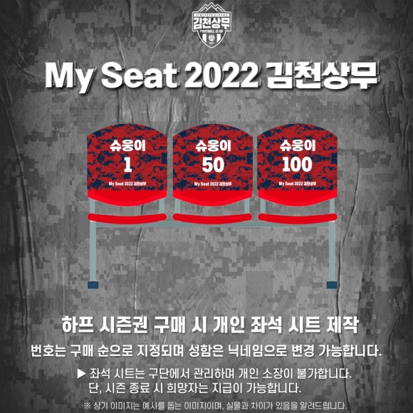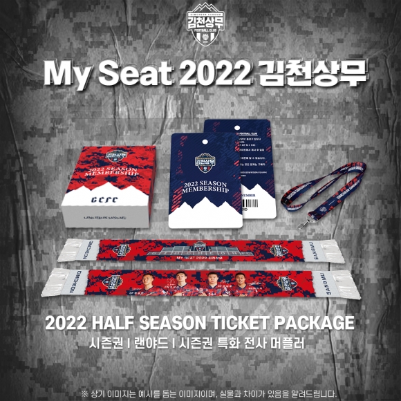 김천상무프로축구단(대표이사 배낙호)이 5월 5일 오전 10시부터 온라인 티켓링크, 오프라인 사무국 및 홈경기 시 장외부스를 통해 ‘My Seat 2022 김천상무’ 판매를 시작한다. ‘My Seat 2022 김천상무’는 김천상무 하프 시즌권이며 1일부터 31일까지 100개를 한정 판매한다. 시즌권 카드에는 좌석번호, 이름이 인쇄되며 5월 둘째 주부터 주 1회 순차적으로 발송할 예정이다. 시즌권 패키지는 5월 14일 경기부터 현장 수령도 가능하다.