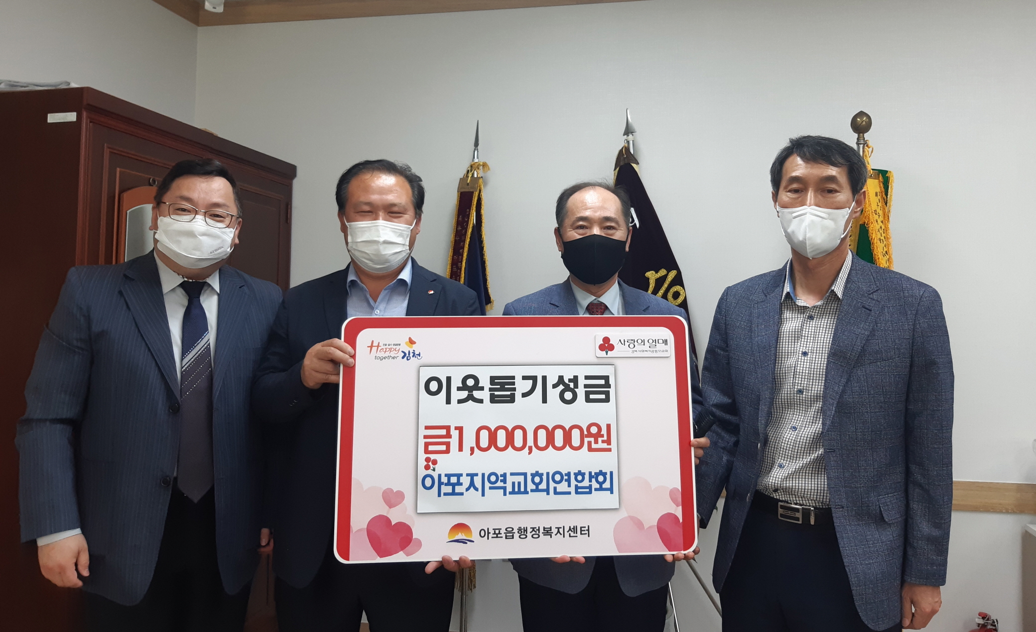 | 아포지역교회연합회(회장 정연걸)는 지난 5월 4일, 김천시 아포읍행정복지센터(읍장 이상진)를 방문해 코로나19의 장기화로 인해 고통 받는 관내 저소득층을 위해 써달라며 성금 일백만원을 전달했다.