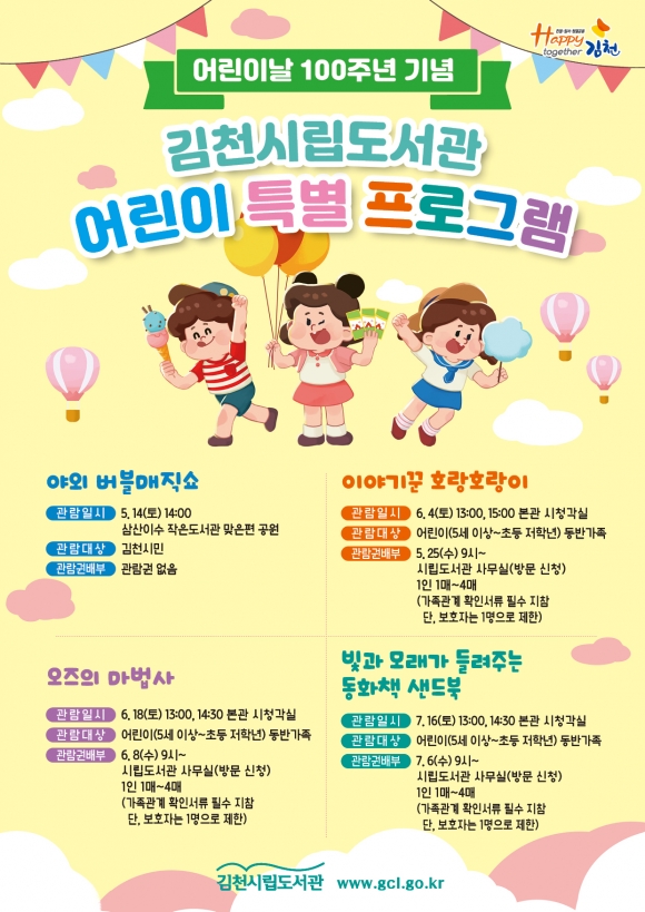 | 김천시립도서관에서는 어린이날 100주년을 기념하여 오는 5, 6, 7월에 야외 공원 및 본관 시청각실에서 4개의 어린이 특별 공연이 진행된다.
