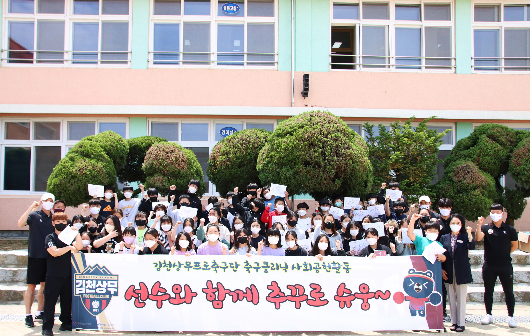 김천상무프로축구단(대표이사 배낙호)이 5월 11일 김천 다수초등학교에서 ‘선수와 함께 추꾸로 슈웅’ 사회공헌활동을 진행했다. 이날 사회공헌활동에는 프로축구선수 김경민, 김정훈을 비롯해 U15 정요한, 이재안 코치, U12 조형준 감독, 박상민 코치가 참여했다. 김천상무는 코로나19 거리두기 단계가 완화됨에 따라 구단 최초로 선수가 참여하는 공식 사회공헌활동을 실시하게 됐다. 코로나19 방역 수칙에 의한 거리두기 및 선수단 대면 행사 제한 조치에 따라 김천상무는 2021년 창단 이래 선수 참여 사회공헌활동을 시행하지 못한 바 있다.