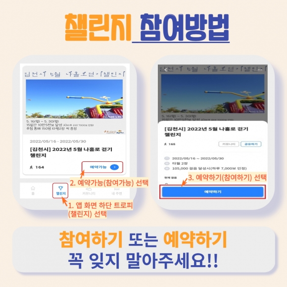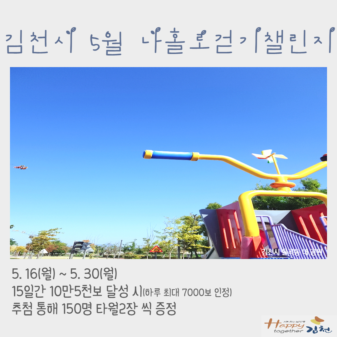 | 김천시는 5월 16일(월)부터 5월 30일(월)까지 15일간 모바일 걷기 앱(워크온)을 활용한‘나홀로 걷기 5월 챌린지’를 실시한다고 밝혔다.