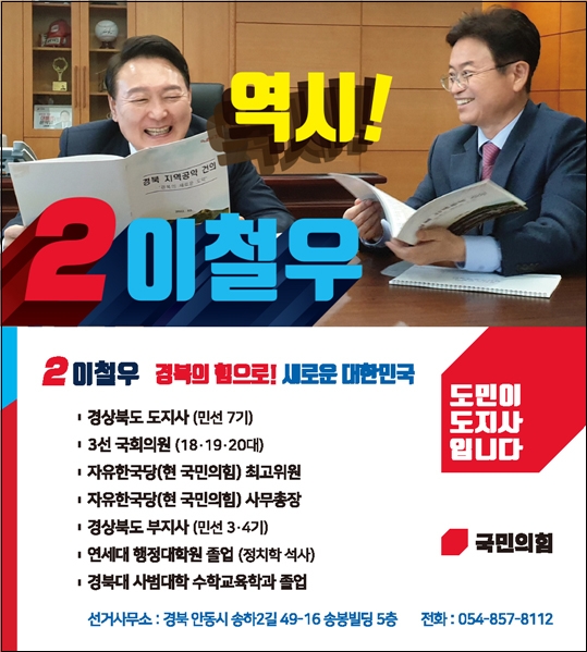 | 국민의힘 기호 2번 이철우 후보는 “더 행복한 경북, 더 건강한 경북, 더 안전한 경북을 만들어 경북을 대한민국의 중심으로 만들겠다”라고 밝혔다.