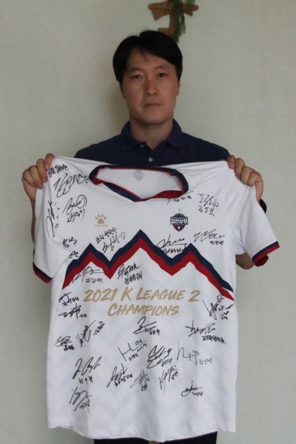 | 김천종합운동장에는 홈경기마다 조규성, 박지수, 정승현, 황인재 등 다양한 선수들의 유니폼이 걸린다. 자신의 최애 선수를 군대로 보냈기에, 경기장에서나마 응원하기 위해서다. 김천 선수들의 등 번호가 적힌 유니폼들이 즐비한 가운데, CHAMPION이 적힌 우승 기념 유니폼 네 개가 연달아 걸린 모습은 이목을 집중시켰다. 지난 2월 김천상무가 판매한 선수단 전원 사인이 담긴 우승 기념 유니폼은 2분 만에 완판됐기 때문이다.