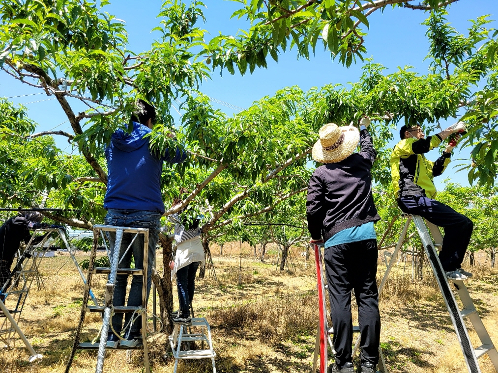 | 지난 5월 16일, 김천시 건설도시과(과장 배정현) 직원 12명은 덕곡동 소재의 복숭아 농가를 방문해 적과 작업에 일손을 보탰다. 농촌 지역은 작년부터 코로나19로 인해 가용 인력이 감소하여 인력난에 시달리고 있는데, 이런 어려움을 조금이나마 덜고자 직원들이 두 팔을 걷고 나선 것이다.