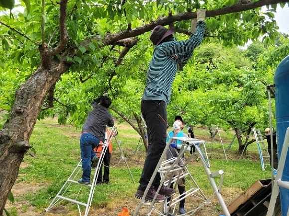 | 김천시 증산면 행정복지센터 직원들은 5월 19일 코로나19 위기와 농촌인구 감소로 농번기 인력부족을 겪고 있는 증산면 부항리 과수 재배농가를 방문해 농촌일손돕기를 실시하였다.