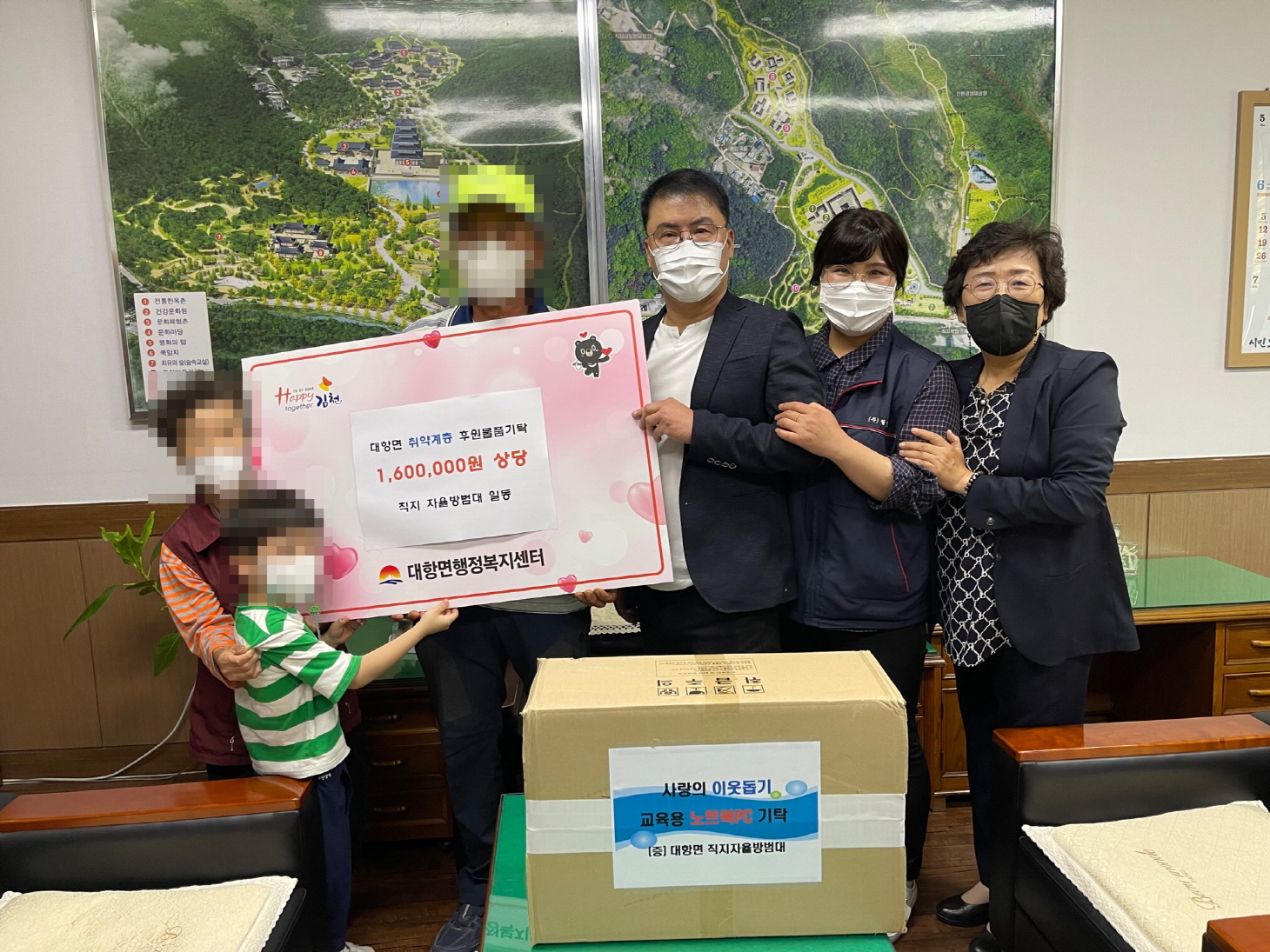 | 김천시 대항면 직지자율방범대(대장 민홍기)에서는 회원들의 성금을 모아 5월 24일(화) 관내 저소득계층 학생들을 위한 노트북 2대(160만원 상당)를 기탁했다.