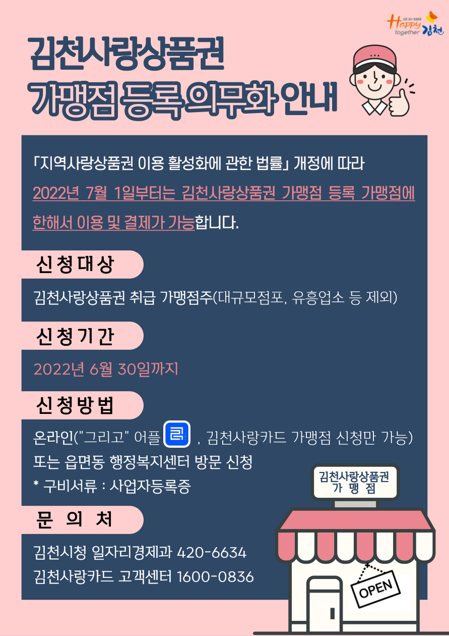 | 오는 7월 1일부터 김천사랑상품권(카드) 가맹점 등록이 의무화된다.
