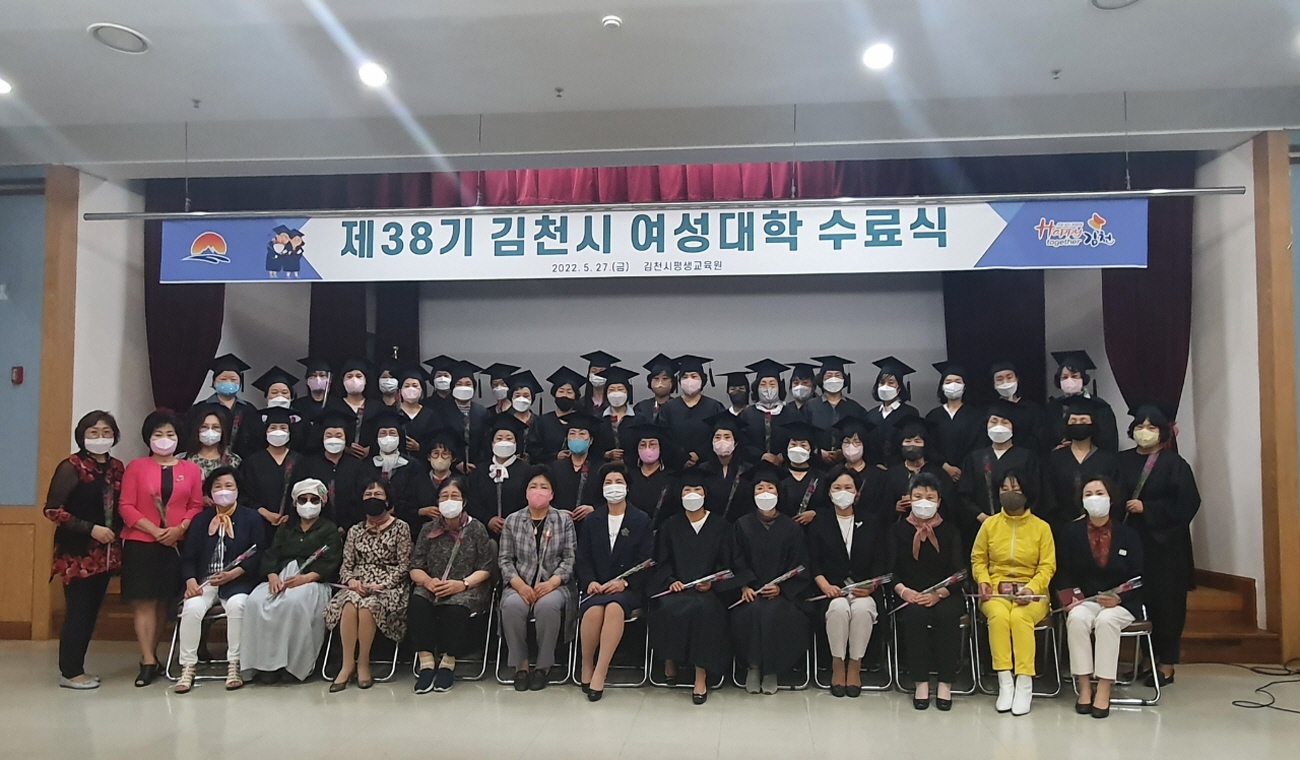 | 김천시평생교육원에서는 5월 27일(금) 김경희 복지환경국장, 여성대학 총동창회(회장 서지선)임원, 여성대학 수강생 등 70여 명이 참석한 가운데『2022년 제38기 김천시여성대학』수료식을 가졌다.