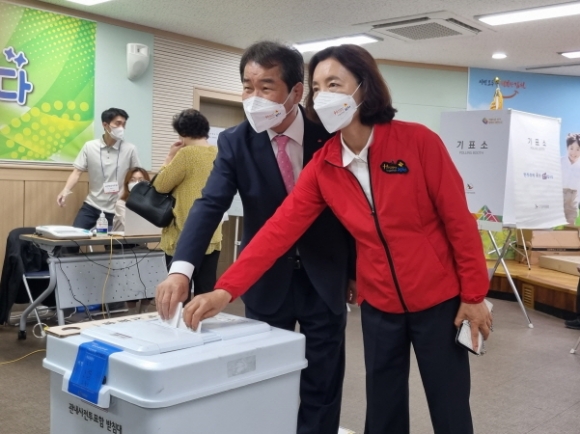 |  | | | ↑↑ [사진설명]6월1일 실시되는 제8회 전국동시지방선거를 4일 앞두고 있는 가운데 지난5월27일 김충섭 시장 후보와 박경자 여사는 대곡동주민복지센터를 찾아 사전투료를 실시했다. | | ⓒ 김천내일신문 | | 김천시에서는 제8회 전국동시지방선거 사전투표 첫날인 5월27일 18시 기준 사전투표 1일차 최종 15.13%의 투표율로 지난 제7회 지방선거 14.25% 대비 0.88% 상승 하였으나 3월 제20대 대선 18.99% 대비 3.86% 낮게 나왔다.
