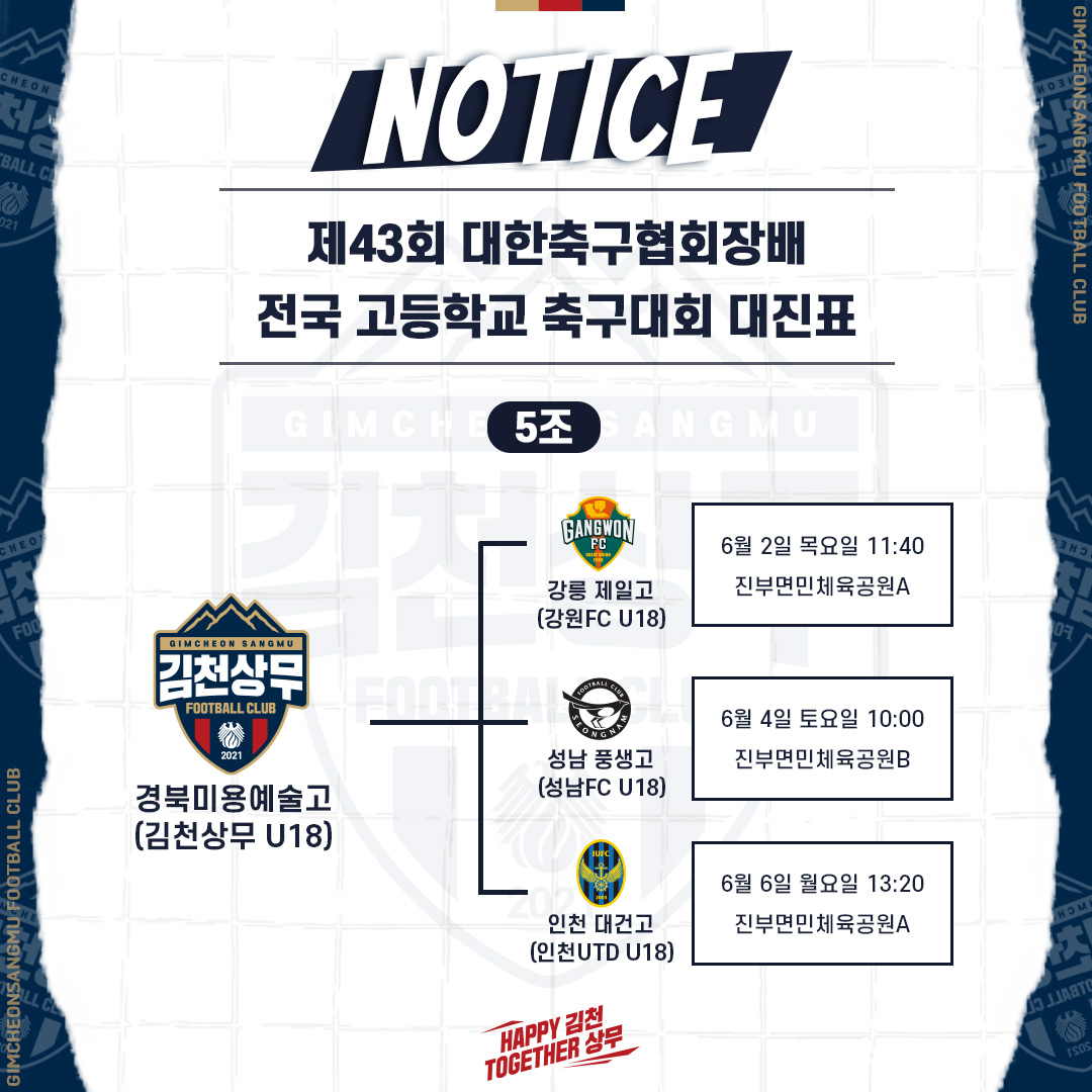 | 김천상무프로축구단 U18(경북미용예술고등학교) 팀이 제43회 대한축구협회장배 전국고등학교 축구대회에 출전한다.