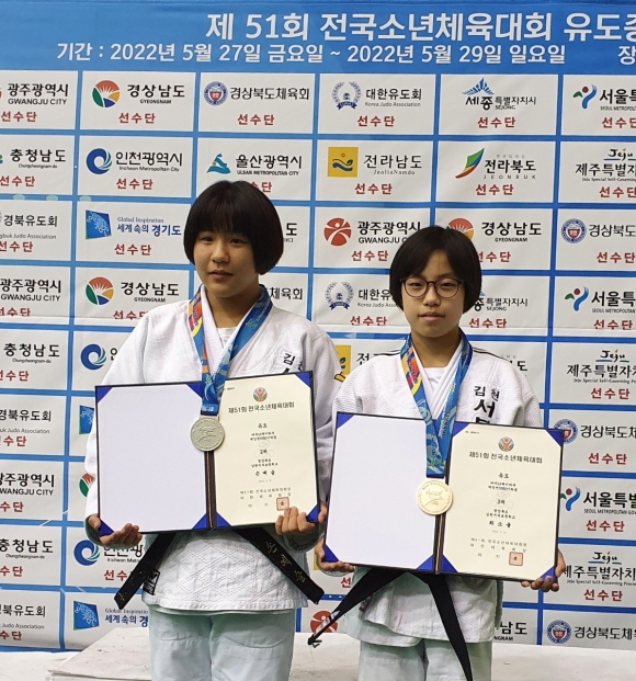 | 김천서부초등학교(교장 최동선) 6학년 손예슬, 최소율 학생은 5월 29일 포항대학교 평보실내체육관에서 개최된 『제 51회 전국소년체육대회』에서 여초부 유도 -57kg, –36kg급에서 각각 2,3위를 차지하는 영광을 안았다.