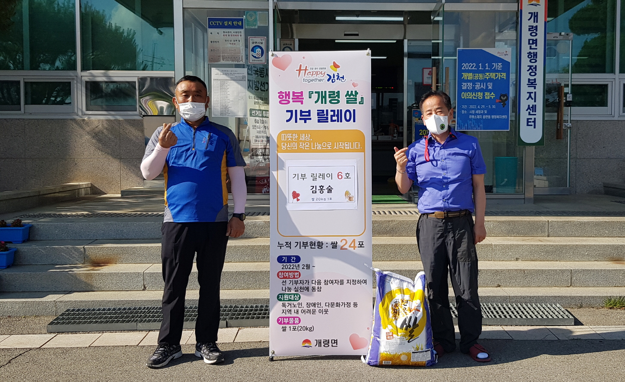 | 개령면 Happy together『행복, 개령쌀 나눔 기부릴레이』는 관내 경제적으로 어려운 가정을 매월 1회 2가구를 선정하여, 개령쌀 20㎏ 1포씩 전달함으로써 이웃사랑 나눔 참여분위기를 조성하고자 올 해 2월부터 시행하고 있으며, 5월을 맞이하여 개인, 기업체 등 총 6개소에서 기부하여, 24가구에 이웃사랑 나눔을 실천할 수 있게 되었다.