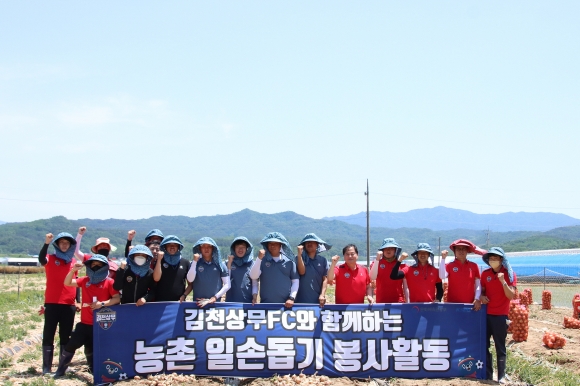 김천상무프로축구단(대표이사 배낙호)이 6월 2일 오전 9시 조마면 신안리에 위치한 1,200평 상당의 양파밭에서 농촌일손돕기 사회공헌활동을 진행했다. 농촌일손돕기에는 배낙호 김천상무 대표이사를 비롯해 김천상무 U15 코칭스태프, U12 코칭스태프 및 사무국 직원들이 참여했다. 양파의 수확 시기에 맞게 김천상무 임·직원은 오전부터 오후까지 양파 수확 과정을 도왔다.