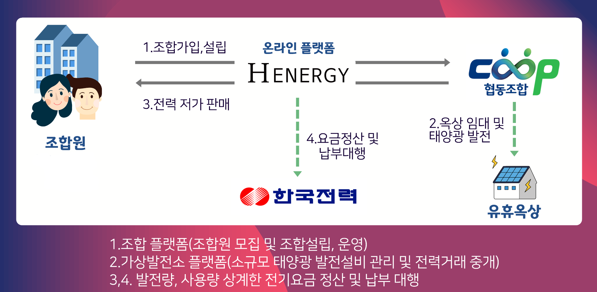 지난해는‘소규모 태양광 전력거래플랫폼 서비스’실증특례를 획득해 조합에서 생산한 재생에너지를 조합원에게 직접 판매할 수 있는 사업모델도 마련했다. 이번 사업을 통하여 최대 1000세대의 참여 조합원을 모집하며, 참여세대는 전체 전기 사용량에서 조합에서 구매한 전기를 저렴한 가격으로 우선 사용하고, 한전에서는 조합원을 통해 구매한 사용량을 제외한 요금을 청구함으로써 전기요금 누진부담* 에서 벗어날 수 있다.