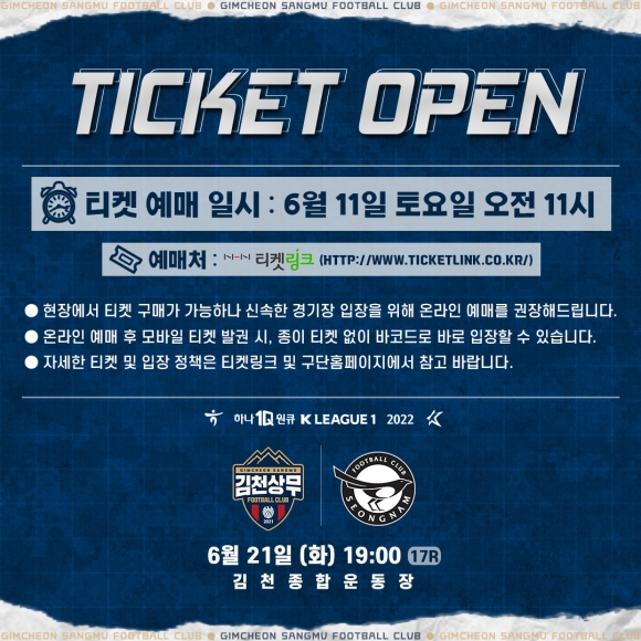 김천상무프로축구단(대표이사 배낙호)이 11일 오전 11시, 온라인 예매 사이트 티켓링크를 통해 21일 오후 7시, 김천종합운동장에서 열리는 ‘하나원큐 K리그1 2022’ 17R 성남FC와 홈경기 티켓 예매를 시작한다.