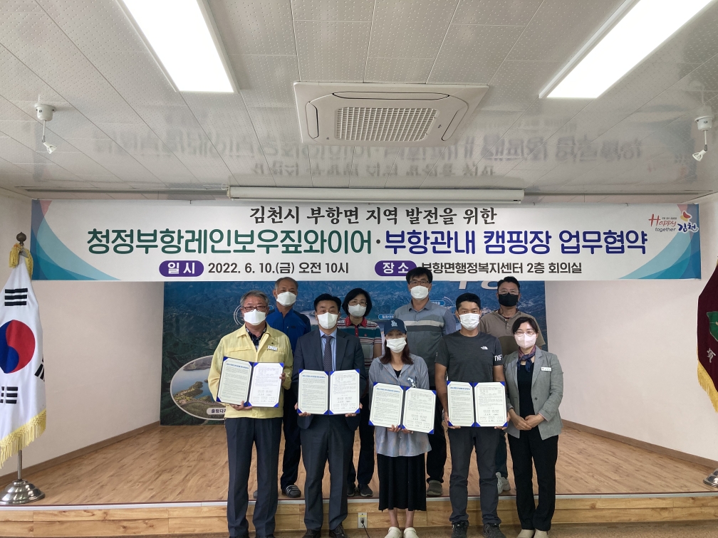 | 김천시 부항면에서는 6월 10일(금) 면사무소 2층 회의실에서 김천시 부항면 지역 발전을 위해 김천시 청정부항레인보우짚와이어와 관내 위치한 3곳 캠핑장과 업무 협약을 체결했다.