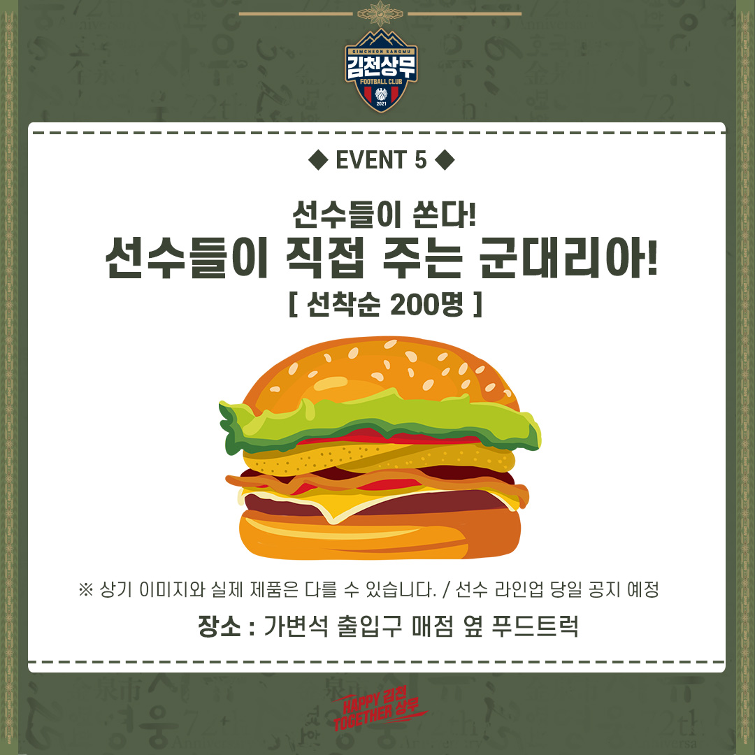 | 김천상무가 호국보훈의 달을 맞아 프로 선수단이 6월 17일 수원FC전 홈경기에서 군대리아(밀리터리 버거)를 선수단이 선착순으로 배부한다.