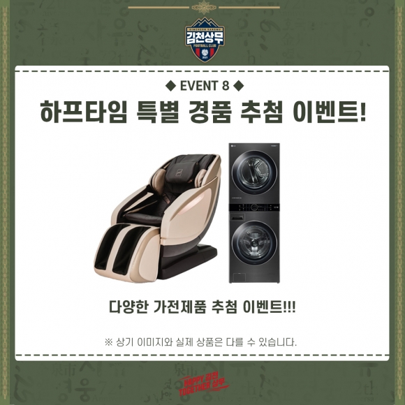 | 이번 홈경기 하프타임에는 다양한 경품이 걸린 하프타임 경품 추첨이 예정돼있다. 안마의자, 세탁기 등 특별 경품 추첨을 진행한다. 2022 사인볼이 걸린 하프타임 맞혀보슈웅 퀴즈 이벤트도 실시한다. 호국보훈의 달 관련 퀴즈를 맞힐 시, 2022 김천상무프로축구단 사인볼을 증정한다.
