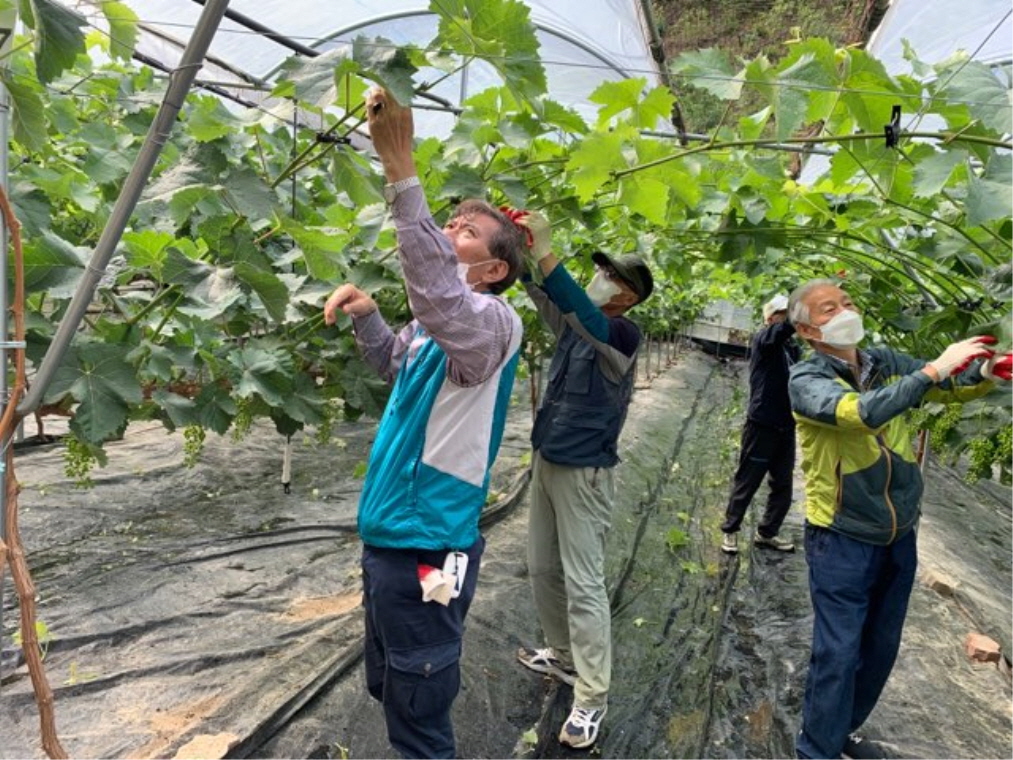 이날 궂은 날씨에도 직원들과 회원들은 아침 일찍부터 나와 영농작업에 대한 간단한 설명을 듣고 포도, 샤인머스캣 순 따기 작업을 했다.