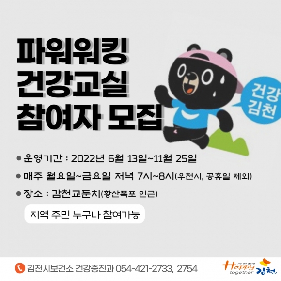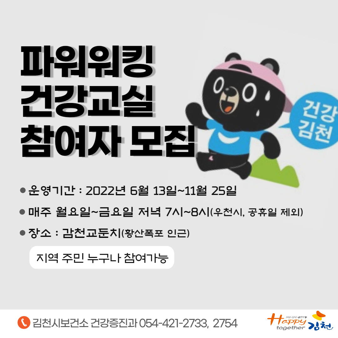 | 김천시는 포스트 코로나시대에 신체활동이 위축된 시민들을 위해 ‘파워워킹 건강교실’을 지난 6월 13일부터 11월 25일까지 운영하고 있다고 밝혔다.