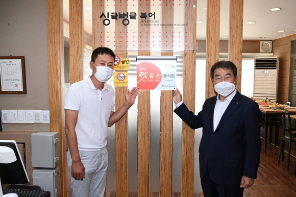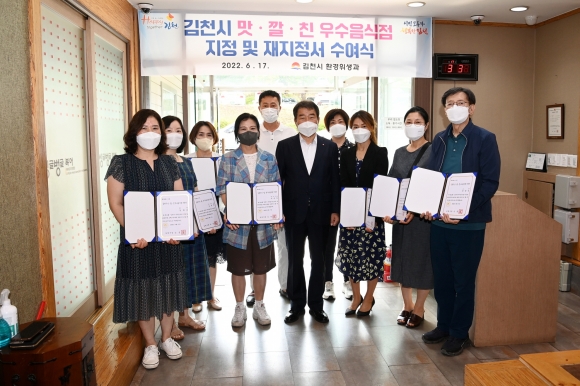 | 김천시(시장 김충섭)는 2022년 상반기 맛․깔․친 우수음식점 지정서를 6월 17일 신음동 소재 싱글벙글에서 김천의 맛과 멋을 담고 있으면서 “Happy together 김천” 운동을 모범적으로 실천하는 “김천시 맛·깔·친(맛있고 깔끔하고 친절한 업소) 우수음식점” 1개소 선정과 우수음식점 8개소를 재지정하여 지정서를 수여했다.