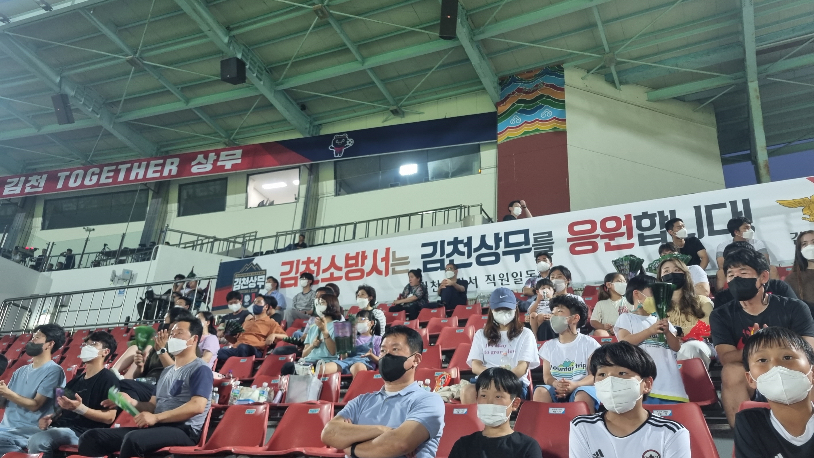 | 김천소방서(서장 전우현)는 지난 6월 21일 김천종합운동장에서 직원 및 직원가족 174명과 함께 우리 지역을 연고지로 하고 있는 김천상무프로축구단 홈경기 단체관람 행사를 진행했다고 밝혔다.