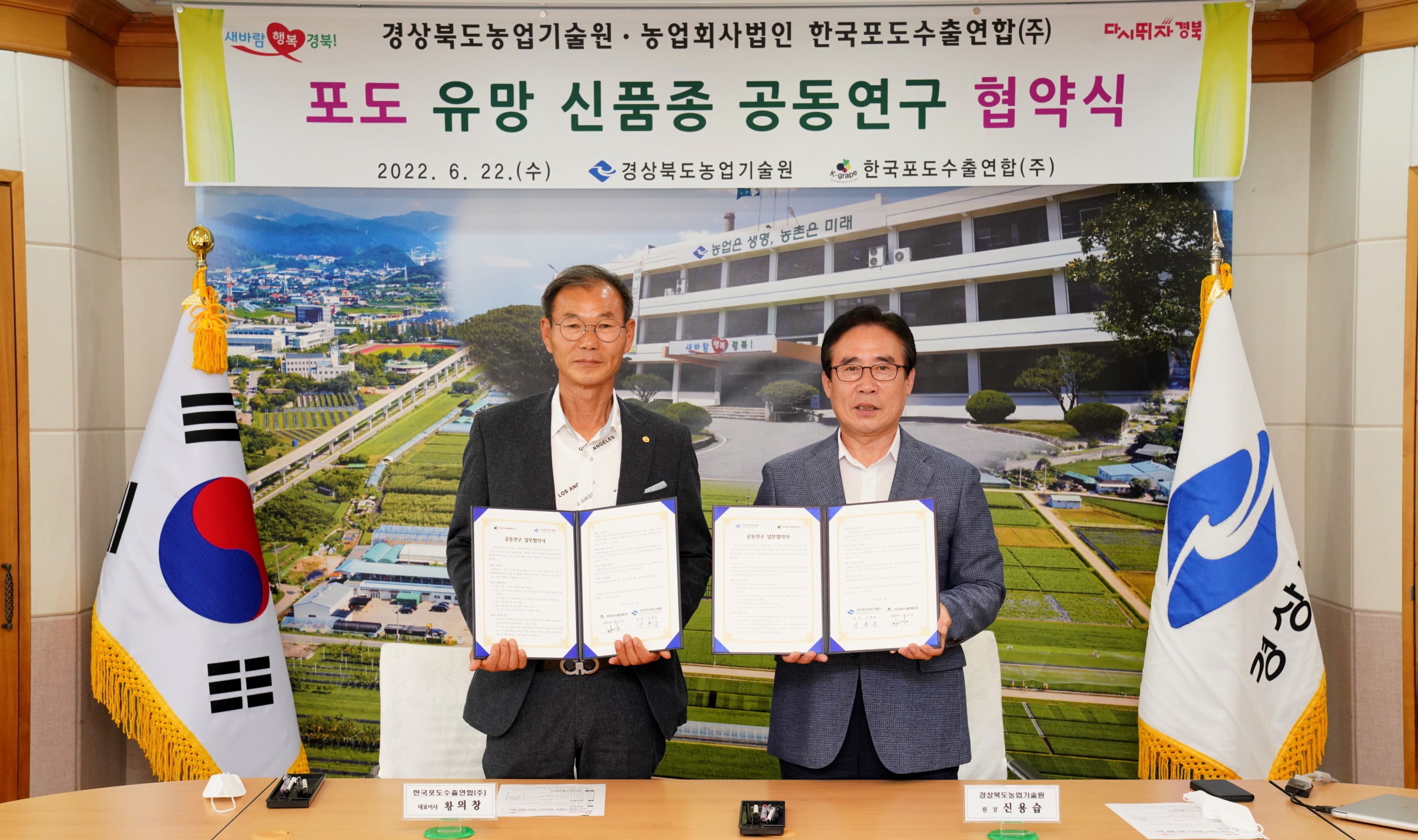 | 경상북도는 6월 22일 농업기술원에서 지역에서 육성한 포도 신품종 보급 및 수출활성화를 위한 공동연구를 위해 한국포도수출연합와 업무협약을 체결했다.
