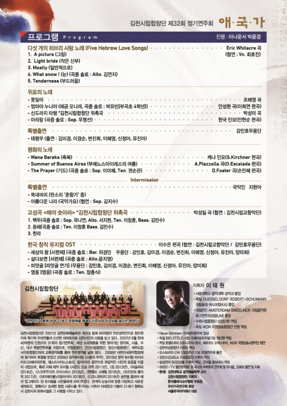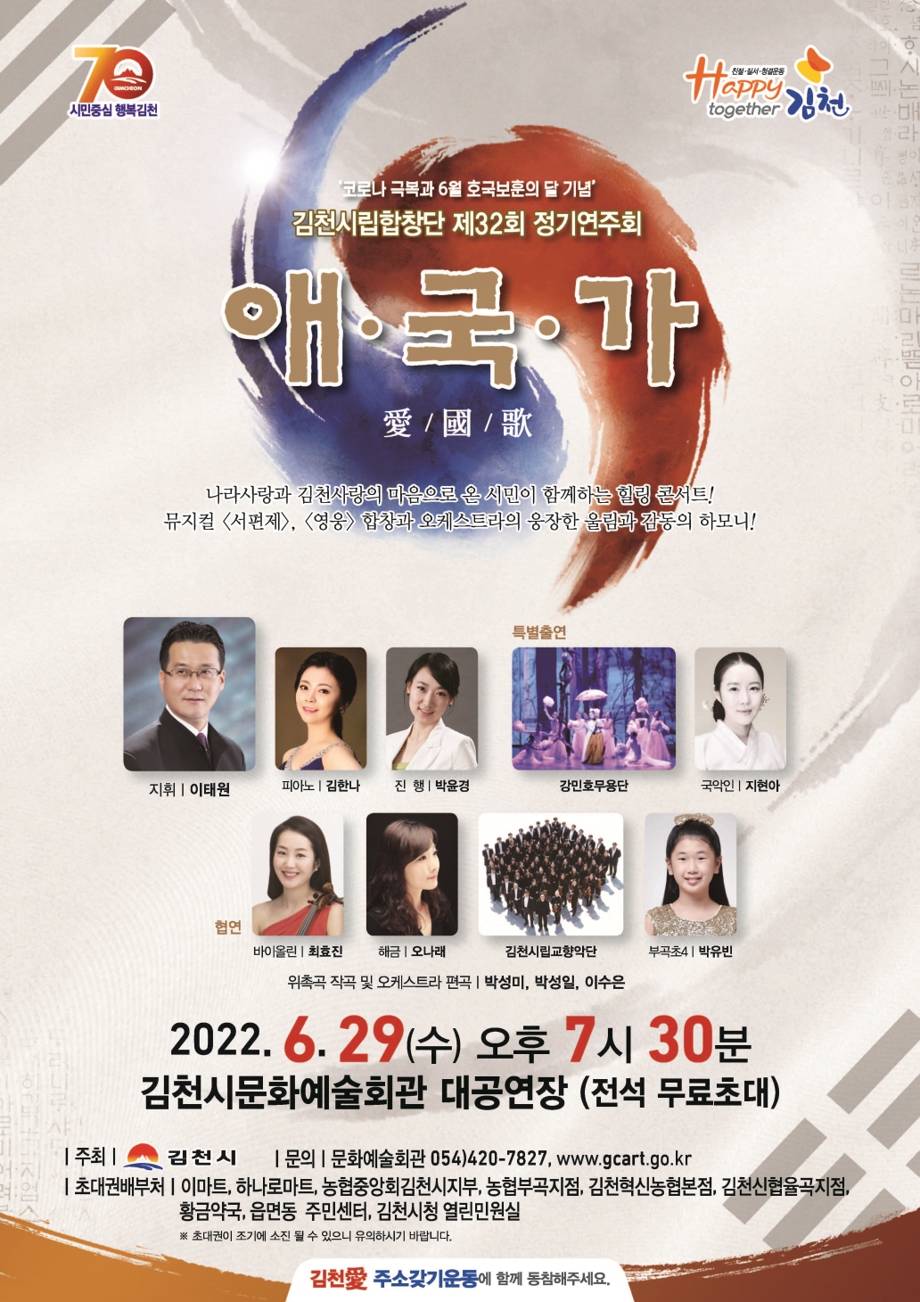 | 김천시 문화예술회관(관장 김훈동)에서는 6월 29일(수) 오후7시 30분 김천시 문화예술회관 대공연장에서 김천시립합창단 제32회 정기연주회 “애국가”를 개최한다.