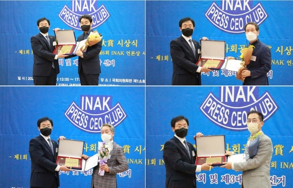 제1회 INAK 발전공로大賞에는 특정 집단의 이익을 위해 대다수 국민들을 희생시키는 편파적 언론정책의 폐해를 널리 알리고 이를 저지하는 등 공익적 가치 수호에 공로가 있는 헬스컨슈머 조동환 대표이사(전 대한약사회약사공론 편집주간), 사이언스MD뉴스 김영길 편집인, 전국뉴스 김진구 대표이사, 한국사회적경제신문 고재철 대표이사, 인터넷한국뉴스 송기만 대표이사, 빅데이터뉴스 임경오 발행인 등 총 6인이 수상의 영예를 안았다.