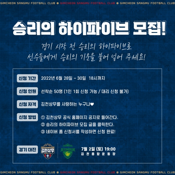 | 김천상무가 전북전 홈경기 승리의 하이파이브 행사에 참가할 팬을 모집한다.