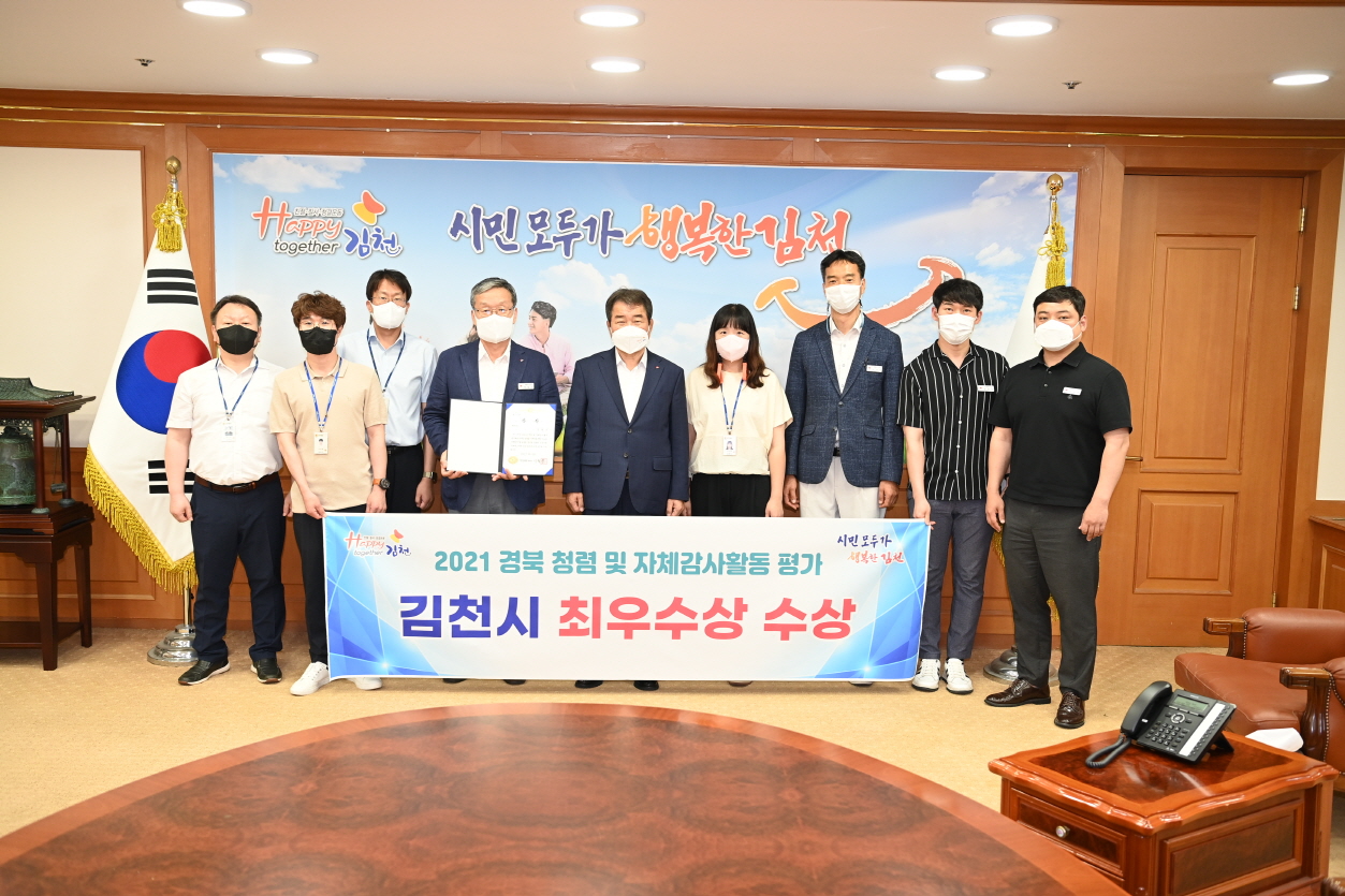 | 김천시가 경상북도가 시행한‘2021년도 청렴 및 자체감사활동’평가에서 부패방지 시책, 자체감사활동 추진 우수성을 인정받아 시부 최우수상을 수상하였다.