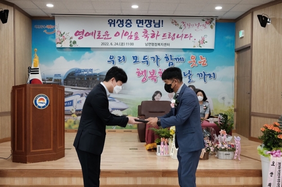 | 남면(면장 위성충)에서는 6월 24일(금) 행정복지센터 3층 강당에서 단체장 및 기관장, 이장, 노인회장, 가족 및 지인, 그리고 동료 선후배 공무원 등이 참석한 가운데 위성충 남면장 이임식이 개최됐다.