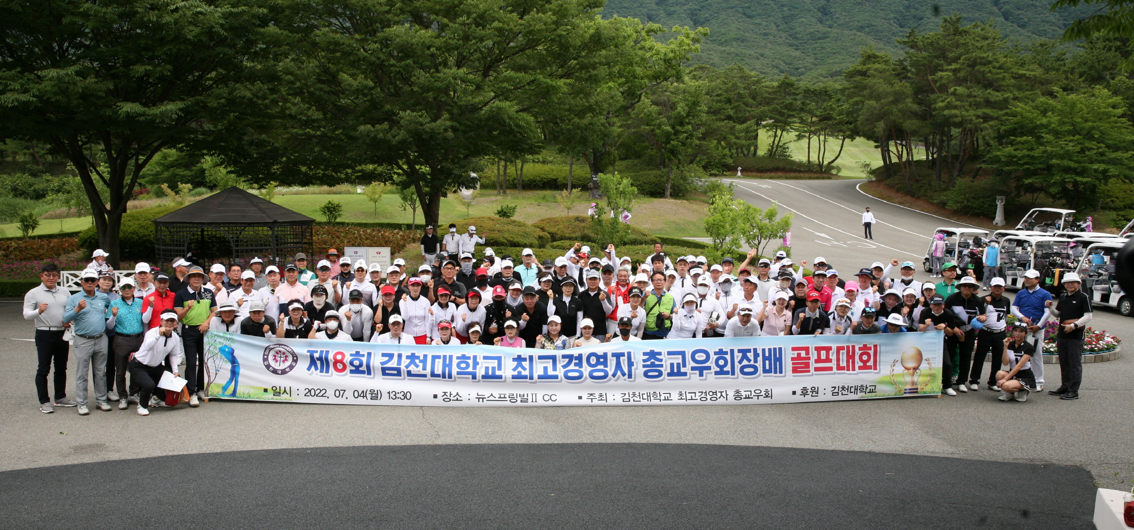 | ‘제8회 김천대학교 최고경영자과정 총교우회장배 골프대회’가 뉴스프링빌ⅡCC에서 7월 5일 개최되었다. 김천대학교(윤옥현 총장) 최고경영자과정 총교우회(회장 권기철)가 주최 및 주관하여 42개팀 총 168여명이 참석한 가운데 진행되었다.
