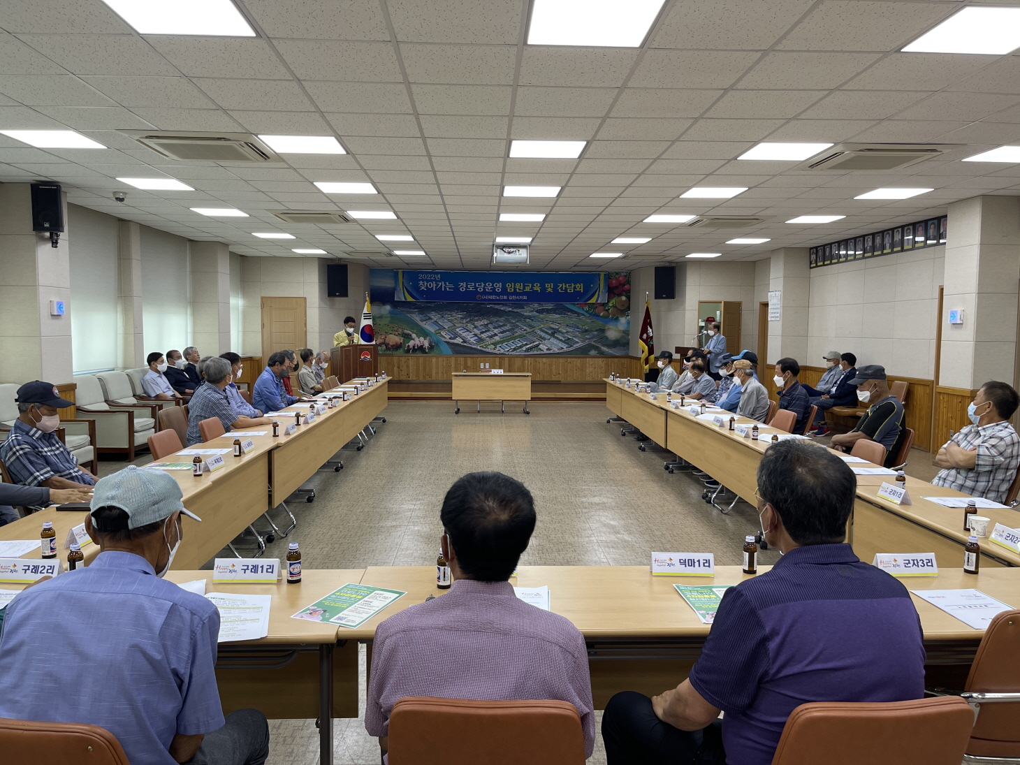 편재관 노인회장은 “무더운 날씨에도 불구하고 참석하여 주셔서 감사하며, 뉴스를 보면 최근 열사병으로 많이 사망한다고 하는데, 더운 날씨에 농사일 하시더라도 건강을 생각하며 해주시길 바란다”고 말했다. 또한 “그동안 못했던 이야기를 허심탄회하게 하고, 다 털어놓고 가는 자리가 되었으면 좋겠다”고 말했다.